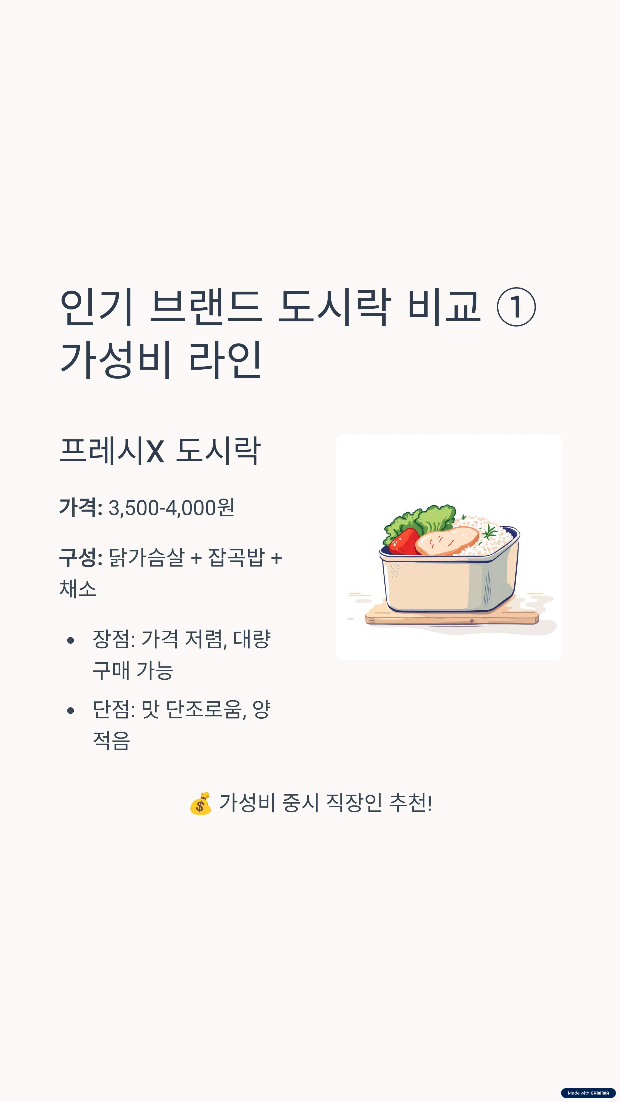 | 프레시X | 1팩 3,500~4,000원 | 닭가슴살 | 가성비, 기본 구성 | 가성비 중시 직장인 |