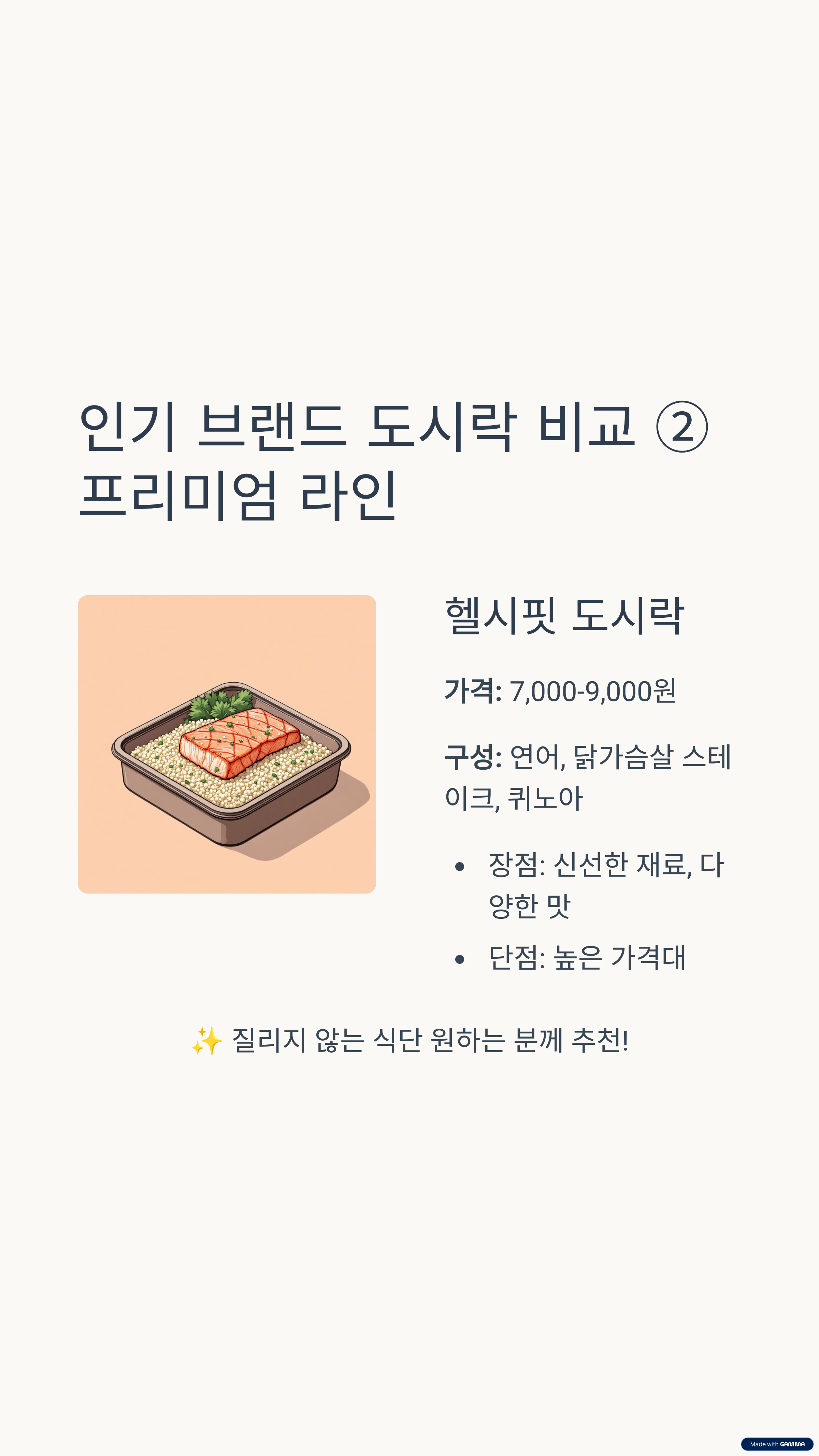 - 구성: 연어, 닭가슴살 스테이크, 퀴노아 포함